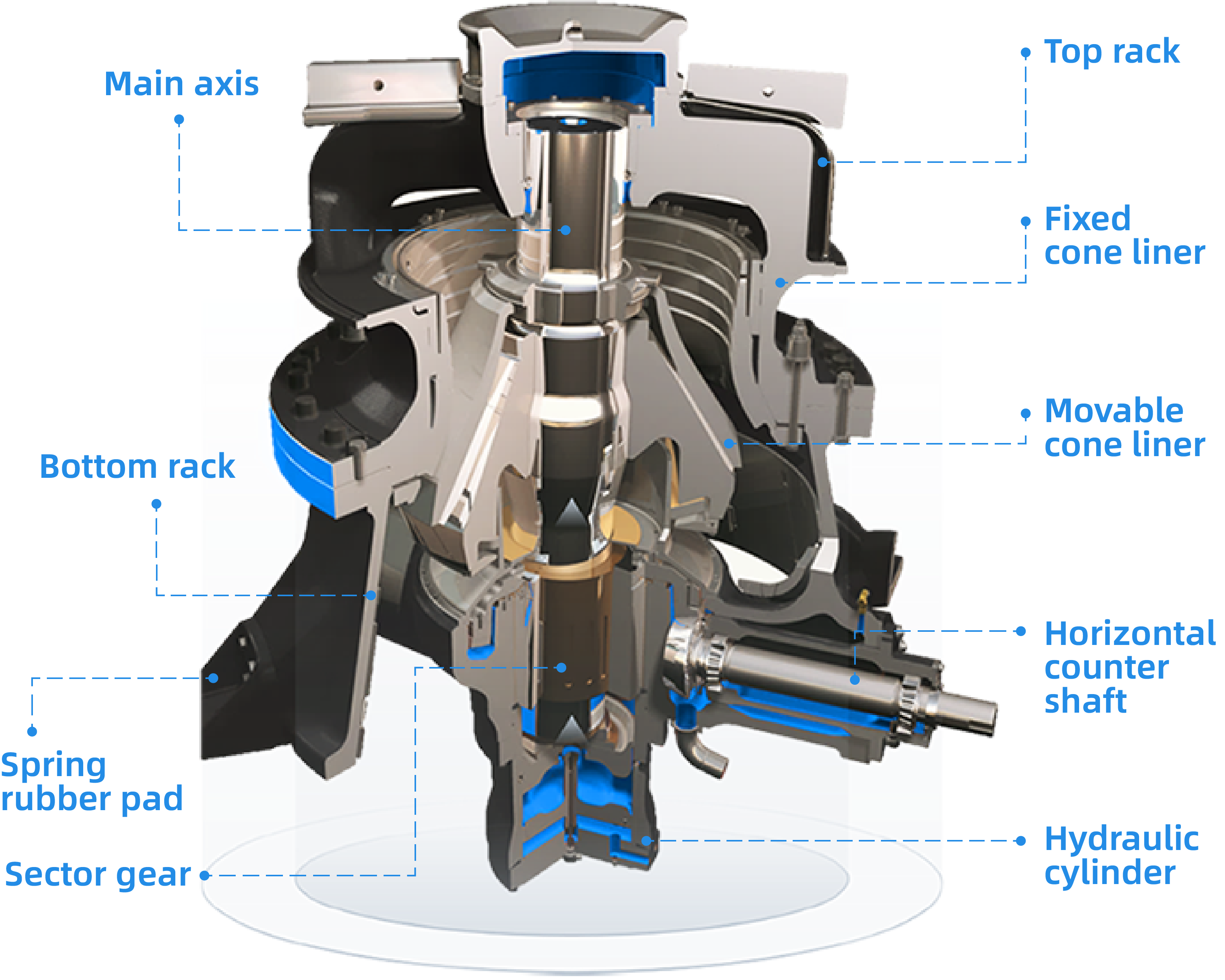 With assistance of position sensors and pressure sensors, the main axis position and discharge opening size can be automatically regulated by hydraulic cylinders, enabling automatic control.