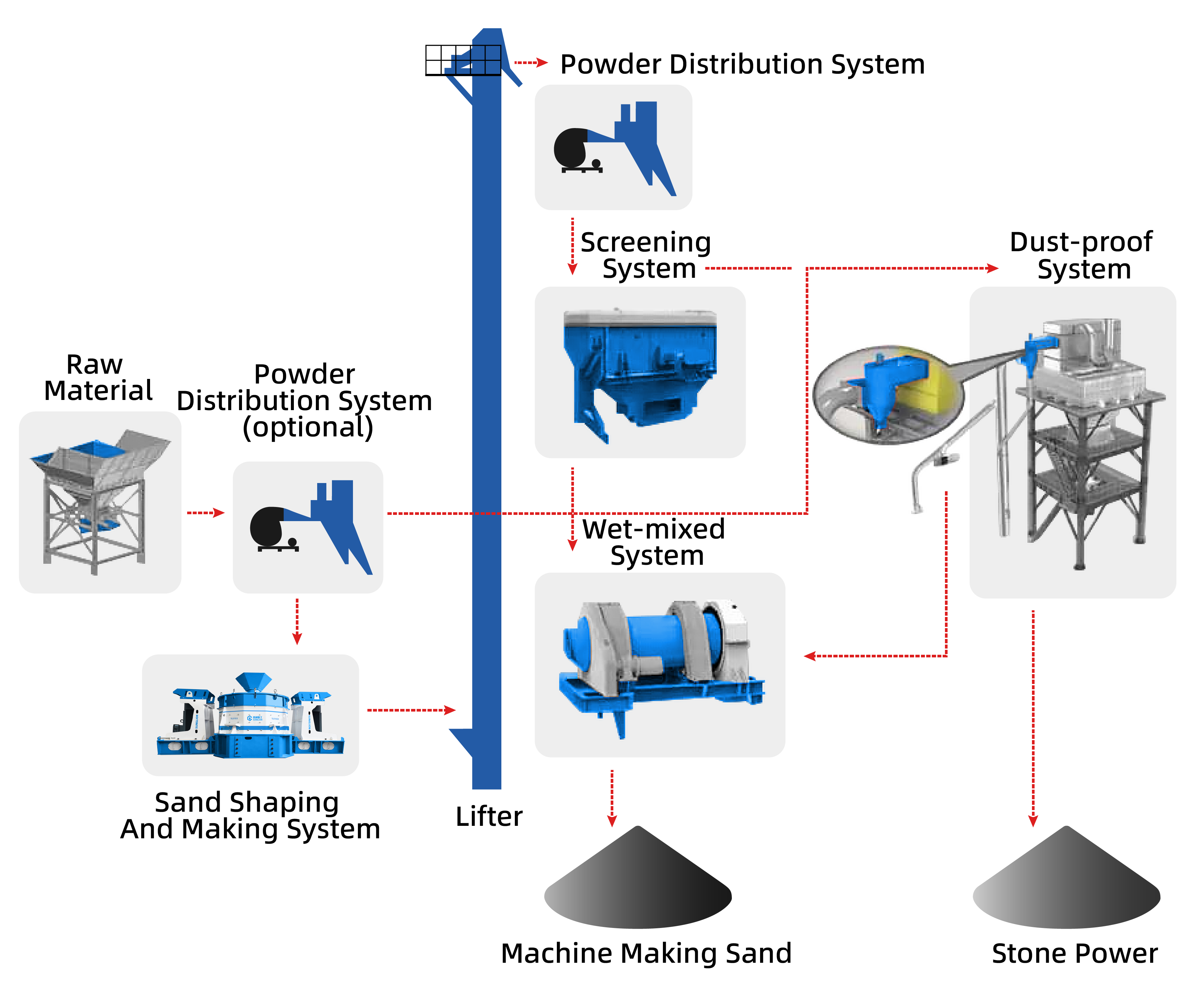 The STSL stepped sand making plant is a tower-like sand making system that adopts a dry production process. It consists of a loading material conveying system, sand reshaping and screening system, dust-proof system, stone powder storage system, and electrical control system. The raw materials are fed into the top floor through a bucket elevator. Broken stones ranging from 0-60mm are then sent to the Talus sand maker through a raw material conveyor belt. Through high-frequency rock-on-rock grinding, the material is delivered to the stone powder separation cavity. The sand powder content is regulated by adjusting the size of the air inlet of the powder control box and the air volume of the system. The processed material enters the sorting screen to select fine crushed stones, stone powder, and semi-finished sand. The stone powder is collected as fine stone powder after being processed by a dust-proof and dust collection system, while the semi-finished sand is evenly mixed by a humidifying mixer to form fine mechanism sand.