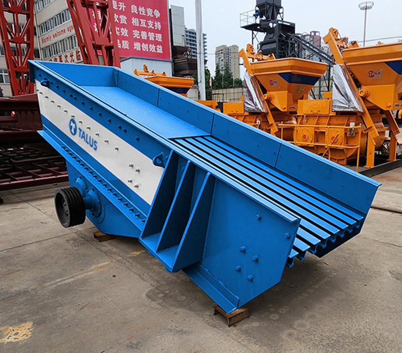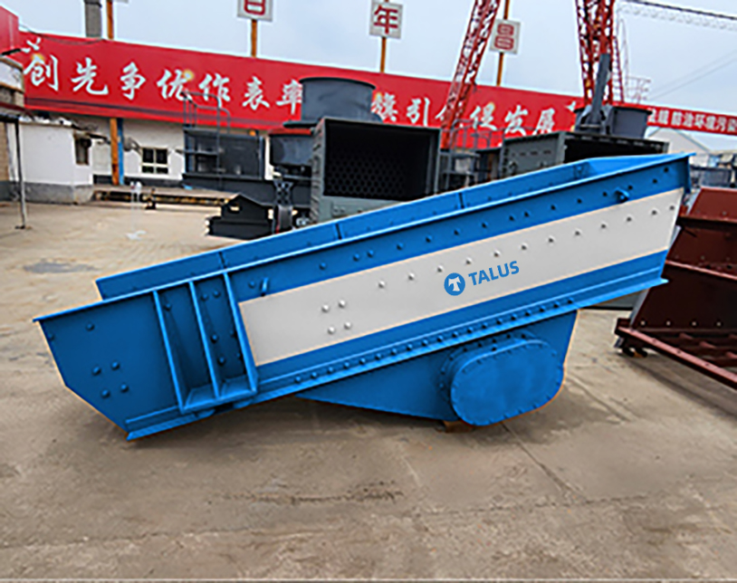The vibrating feeder consists of feeding trough, exciter, spring support and transmission device, etc. The vibration source of feeding trough is exciter, which is composed of two eccentric shafts (active and passive) and gear pairs. The motor drives the active shaft through a triangular belt, and then gear on the active shaft meshes with the passive shaft. The active shafts and passive shafts rotate in opposite directions simultaneously, causing the trough to vibrate and continuously convey materials.